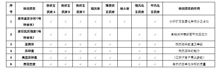 (6)招標(biāo)范圍及內(nèi)容:對(duì)諭興礦礦區(qū)南側(cè)+5m以上8種玄武巖原石檢測(cè)(檢測(cè)項(xiàng)目具體如下表)。檢測(cè)成果需滿足國(guó)家法律法規(guī)、行業(yè)檢測(cè)標(biāo)準(zhǔn),提供技術(shù)咨詢(xún)服務(wù)與集料破碎。